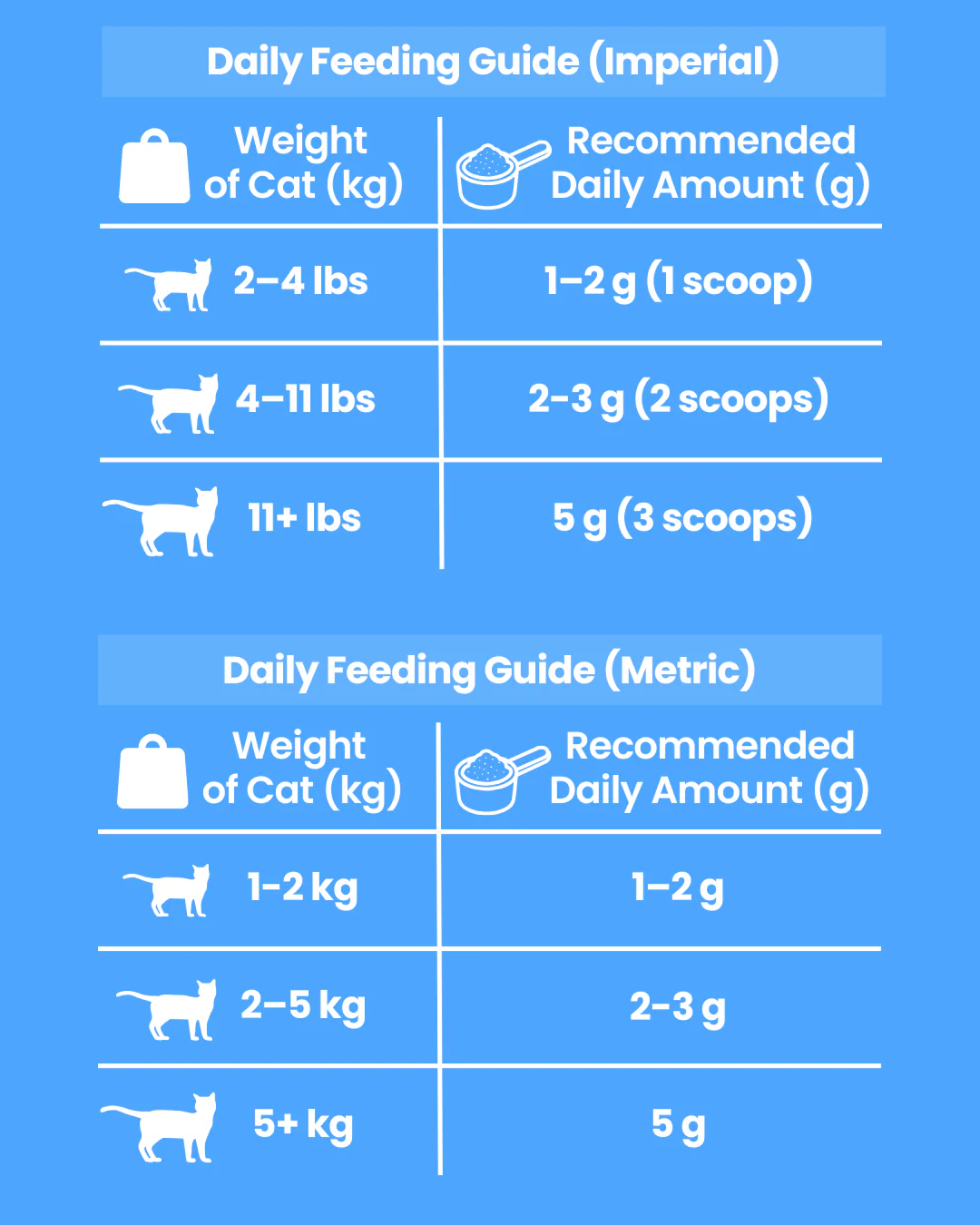 - Cats (3+ months): 2g per dose, twice daily